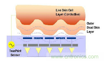工作原理則不一樣;其是利用手指按在芯片表面時(shí),指紋的波峰波谷對芯片內(nèi)部電容上下電極電荷分配的比例影響程度來對指紋進(jìn)行重現(xiàn)指紋,無需額外增加驅(qū)動(dòng)源,芯片結(jié)構(gòu)非常單純(如下圖),也因?yàn)闊o額外驅(qū)動(dòng)信號,所以模組也無需外置Ring,模組結(jié)構(gòu)也非常簡單。