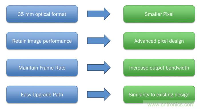 為了在保留35 mm光學(xué)格式的同時(shí),將器件(例如KAI-29050)的分辨率從現(xiàn)有的2900萬(wàn)像素繼續(xù)提升,就需要更小的像素格式,以便將更多像素放置于給定區(qū)域中。但為同時(shí)保留這一較小像素中的關(guān)鍵成像參數(shù),如圖像均勻性、動(dòng)態(tài)范圍和底噪,除了簡(jiǎn)單地縮小尺寸外,還需要提升像素設(shè)計(jì)。