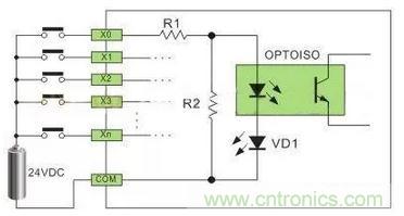 PLC 的數(shù)字量輸入接口并不復雜,PLC 為了提高抗干擾能力,輸入接口都采用光電耦合器來隔離輸入信號與內(nèi)部處理電路的傳輸。因此,輸入端的信號只是驅動光電耦合器的內(nèi)部 LED 導通,被光電耦合器的光電管接收,即可使外部輸入信號可靠傳輸。