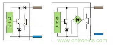 直流兩線制接近開關分二極管極性保護與橋整流極性保護,前者在接PLC時需要注意極性,后者就不需要注意極性。有源舌簧磁性開關主要用在汽缸上做位置檢測,由于需要信號指示,內(nèi)部有雙向二極管回路,因此也不需要注意極性;交流兩線制接近開關就不需要注意極性。如圖10: