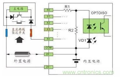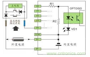 直流電可以由PLC內(nèi)部提供也可以外接直流電源提供給外部輸入信號的元件。R2在電路中的作用是旁路光電耦合器內(nèi)部LED的電流,保證光電耦合器LED不被兩線制接近開關的靜態(tài)泄漏電流導通。