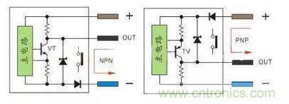 3、有源三線傳感器(電感接近開關、電容接近開關、霍爾接近開關、光電開關等)直流有源三制線接近開關與光電開關輸出管使用三極管輸出,因此傳感器分NPN和PNP輸出,有的產(chǎn)品是四線制,有雙NPN或雙PNP,只是狀態(tài)剛好相反,也有NPN和PNP結合的四線輸出。