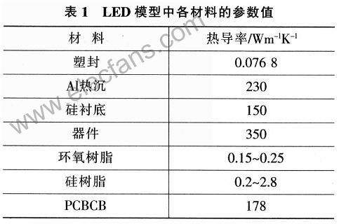 LED輸入功率為1W,光效率取10%;封裝體外部的各組件(包括MCPCB、陶瓷封裝、熱沉的外部)通過與空氣的對(duì)流散熱;器件與外界的熱對(duì)流系數(shù)為20。工作環(huán)境溫度為25℃;器件滿足使用ANSYS軟件進(jìn)行穩(wěn)態(tài)有限元熱分析的條件;最大結(jié)溫選擇為125℃。各種材料的參數(shù)如表1所示。
