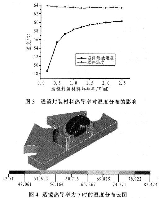 只考慮熱傳導(dǎo)與對(duì)流,改變不同封裝填充材料如硅樹脂.得出結(jié)果,如圖3所示。即使找到一種熱導(dǎo)率高達(dá)7Wm-1K-1的環(huán)氧樹脂成分封裝材料時(shí),相比使用熱導(dǎo)率為0.25Wm-1K-1的環(huán)氧樹脂成分封裝材料時(shí),芯片溫度下降不多,鋁基板溫度只下降了2.271℃,最大功率僅提高了0.69W。實(shí)際上,熱導(dǎo)率值超過7Wm-1K-1以上、可商業(yè)化的透明硅樹脂封裝材料目前尚無文獻(xiàn)報(bào)導(dǎo)。分布云圖如圖4所示。