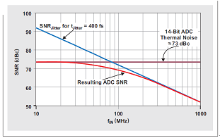 正如我們預計的那樣,利用固定數(shù)量的時鐘抖動,SNR 隨輸入頻率上升而下降。圖 4 描述了這種現(xiàn)象,其顯示了 400 fs 固定時鐘抖動時一個 14 位管線式轉(zhuǎn)換器的 SNR。如果輸入頻率增加十倍,例如:從 10MHz 增加到 100MHz,則時鐘抖動帶來的最大實際 SNR 降低 20dB。