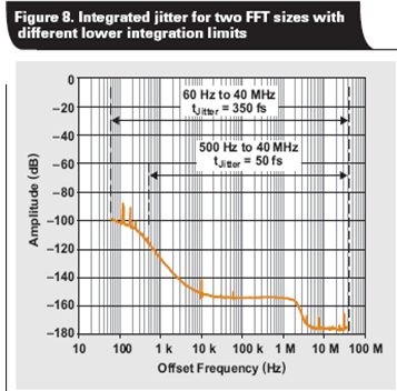 為了進一步描述該點,我們利用兩個不同的FFT尺寸—131,072 和 1,048,576 點,使用 ADS54RF63 進行實驗。采樣速率設定為 122.88MSPS,而圖 8 則顯示了時鐘相位噪聲。我們將一個 6-MHz、寬帶通濾波器添加到時鐘輸入,以限制影響抖動的寬帶噪聲數(shù)量。選擇 1-GHz 輸入信號的目的是確保 SNR 減弱僅由于時鐘抖動。圖 8 表明兩個 FFT 尺寸的 1/2 容器尺寸到 40MHz 相位噪聲整合抖動結果都極為不同,而“表 1”的 SNR 測量情況也反映這種現(xiàn)象。
